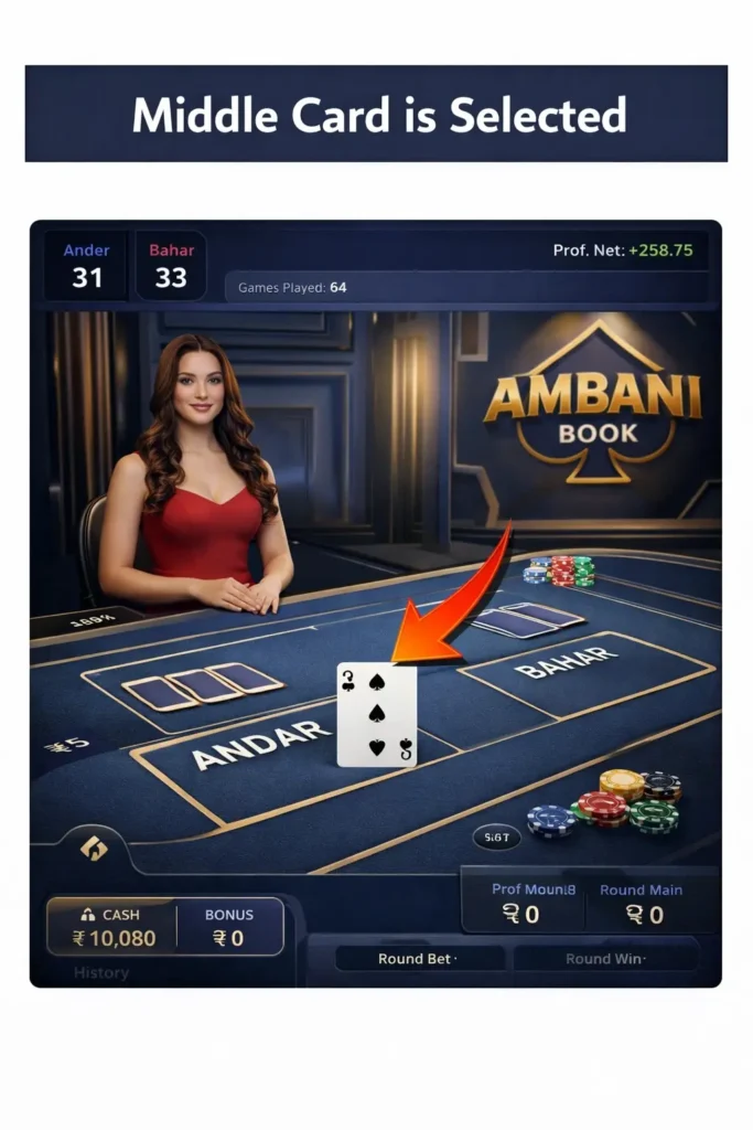 At the start of each round, a professional live dealer opens one card in the center of the table. This card is known as the middle card and acts as the reference point for determining the winning side in that particular round.
